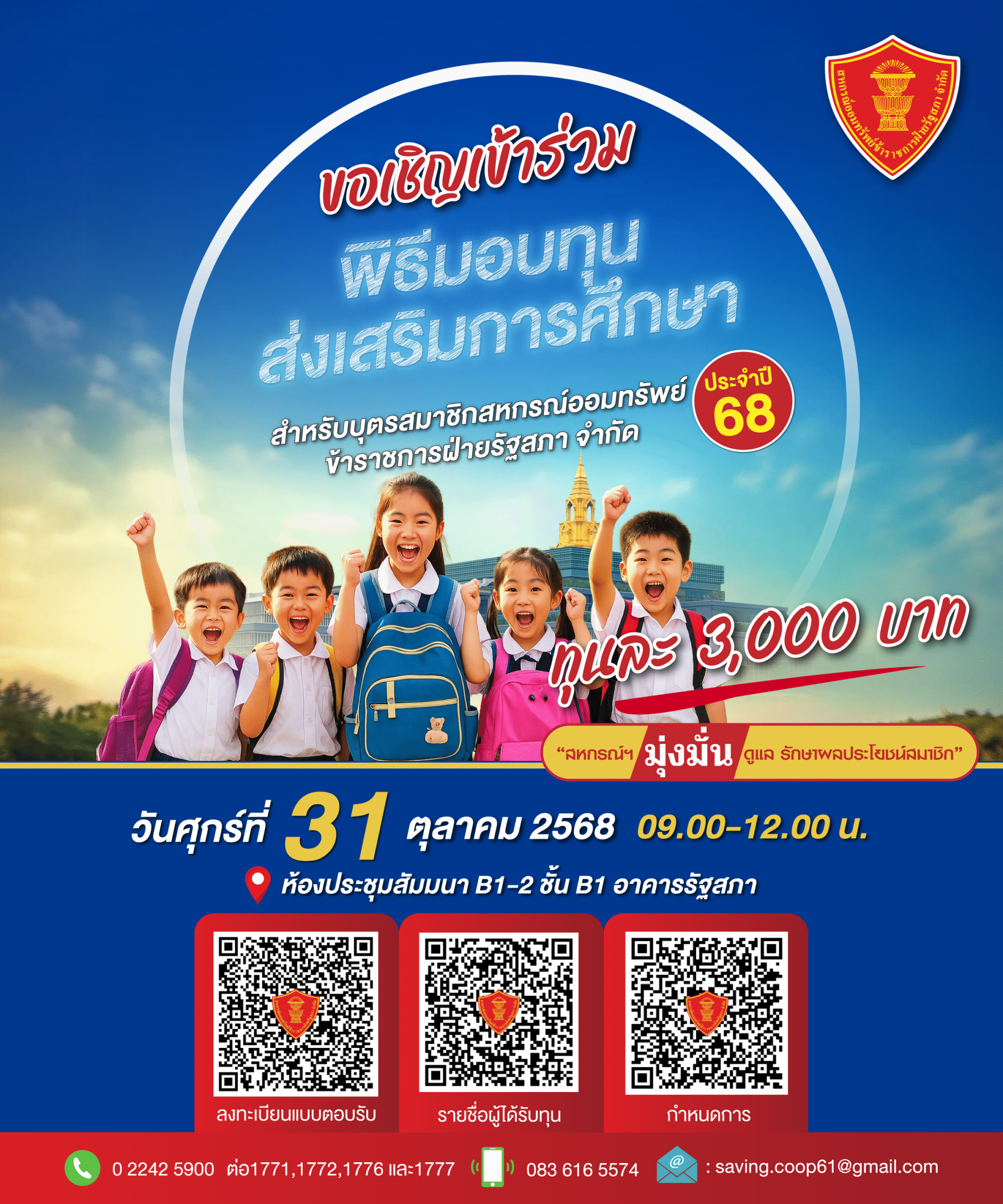 ขอเชิญเข้าร่วม พิธีมอบทุนส่งเสริมการศึกษา สำหรับบุตรสมาชิกสหกรณ์ออมทรัพย์ข้าราชการฝ่ายรัฐสภา จำกัด ประจำปี 2568