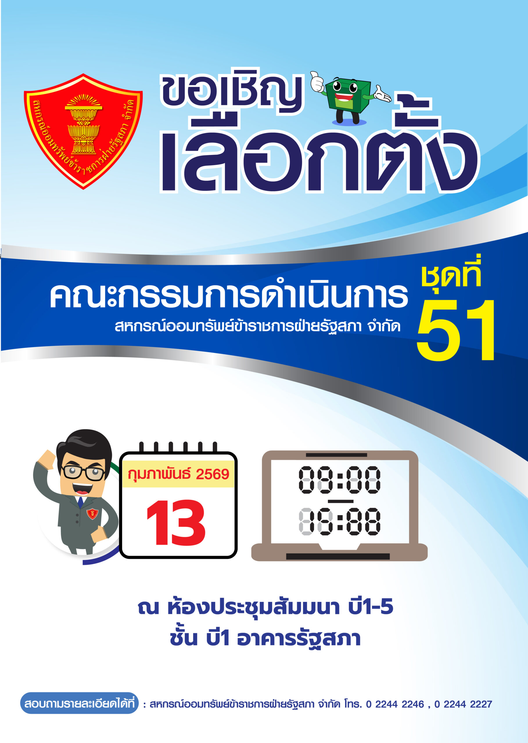 ขอเชิญ เลือกตั้งคณะกรรมการดำเนินการ ชุดที่ 51 ในวันศุกร์ที่ 13 กุมภาพันธ์ 2569 ตั้งแต่เวลา 09.00 – 15.00 นาฬิกา ณ ห้องประชุมสัมมนา B1-5 ชั้น B1 อาคารรัฐสภา