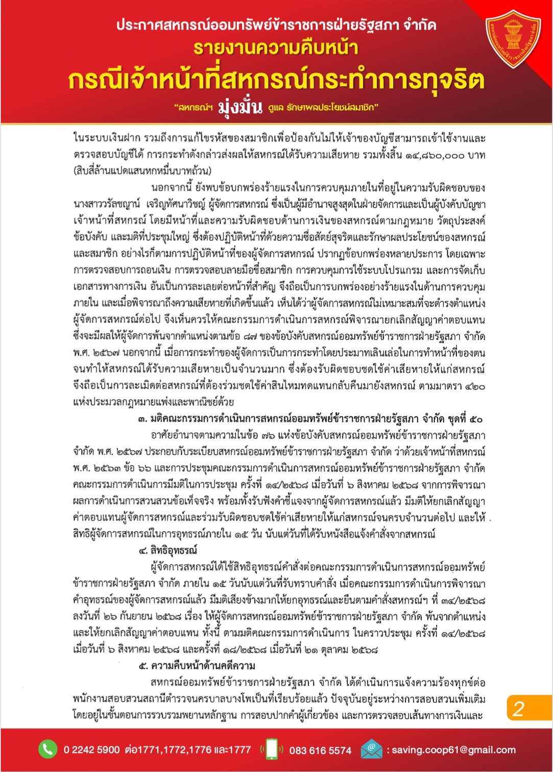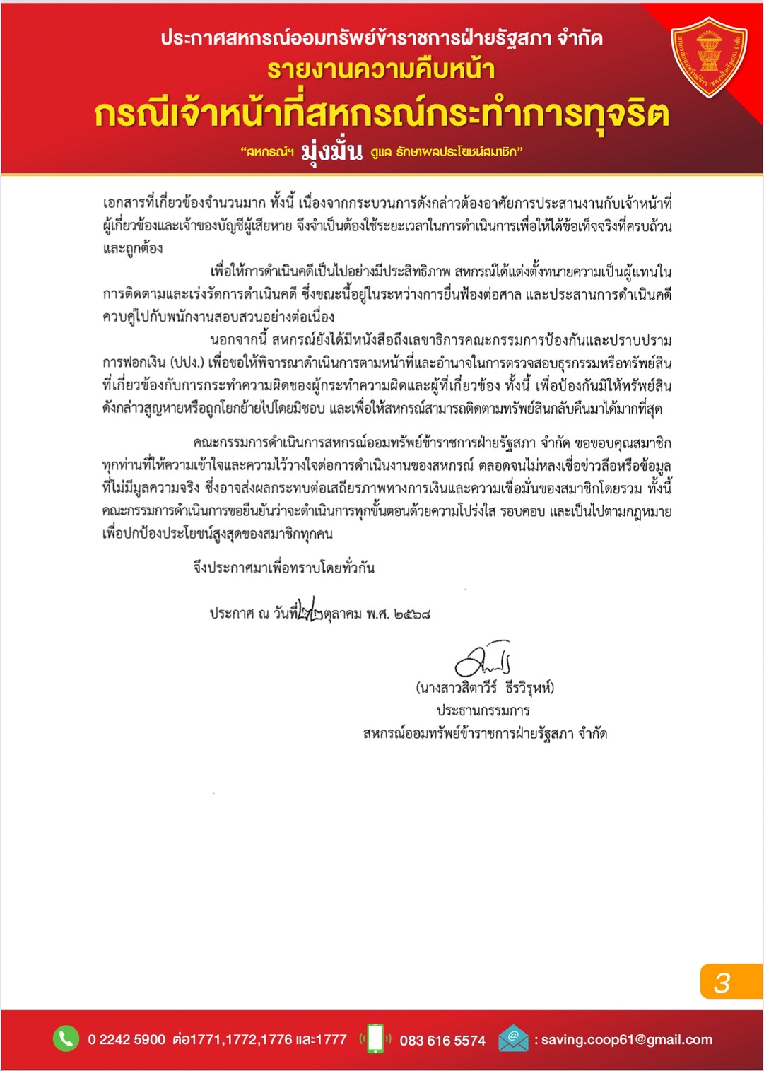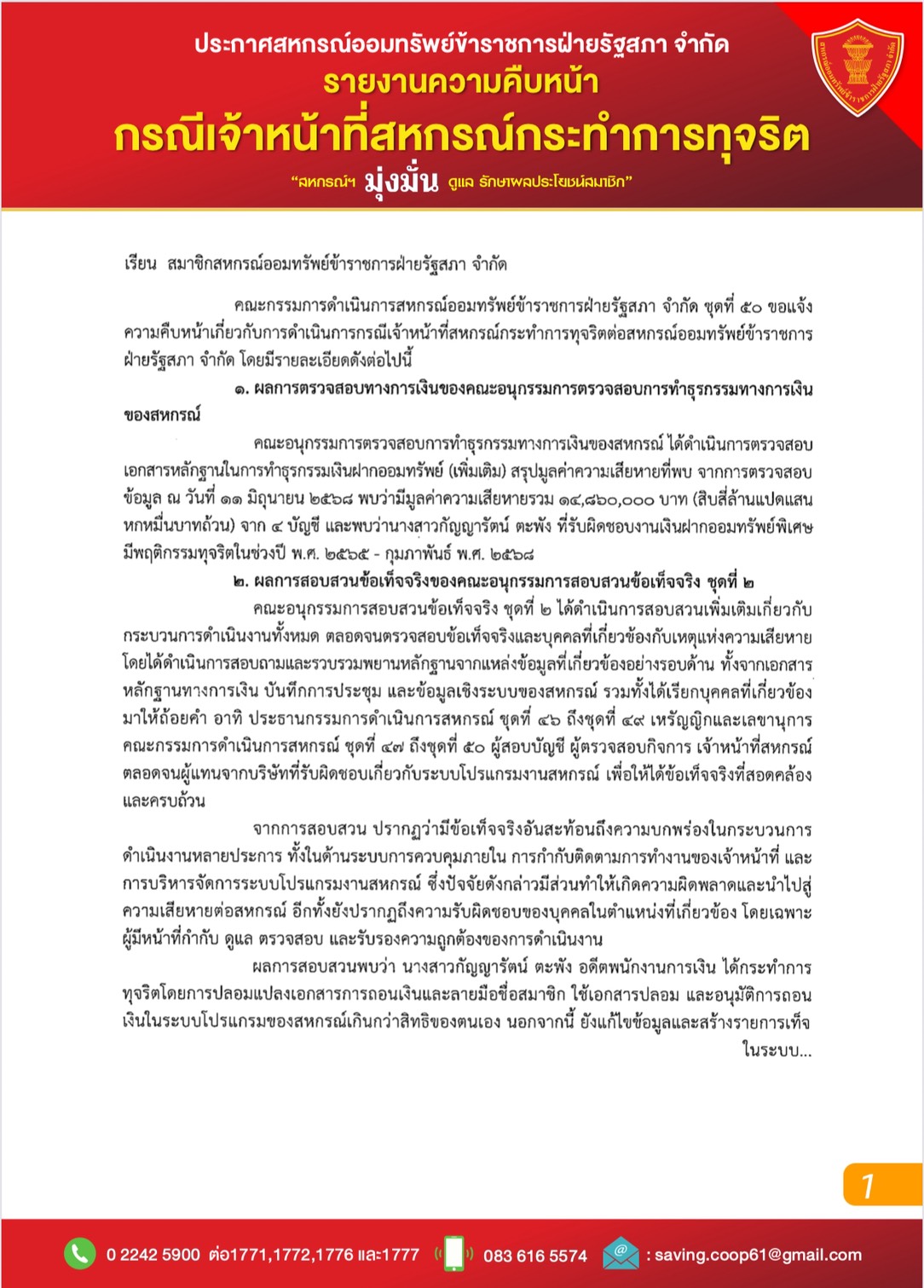 ประกาศ สหกรณ์ออมทรัพยฯ เรื่อง รายงานความคืบหน้า กรณีเจ้าหน้าที่สหกรณ์กระทำการทุจริต