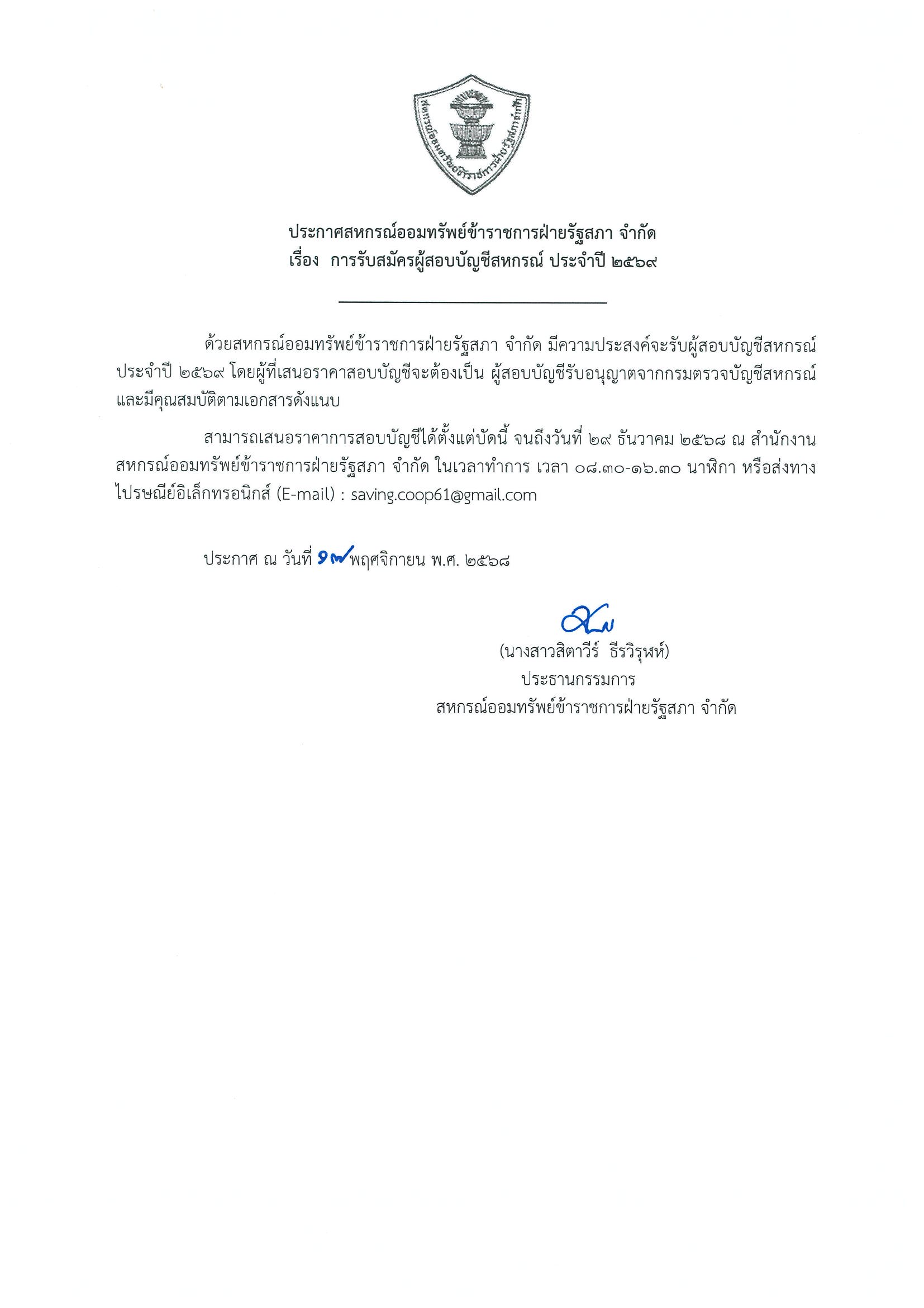 ประกาศ สหกรณ์ออมทรัพย์ฯ เรื่อง การรับสมัครผู้สอบบัญชีสหกรณ์ ประจำปี 2569