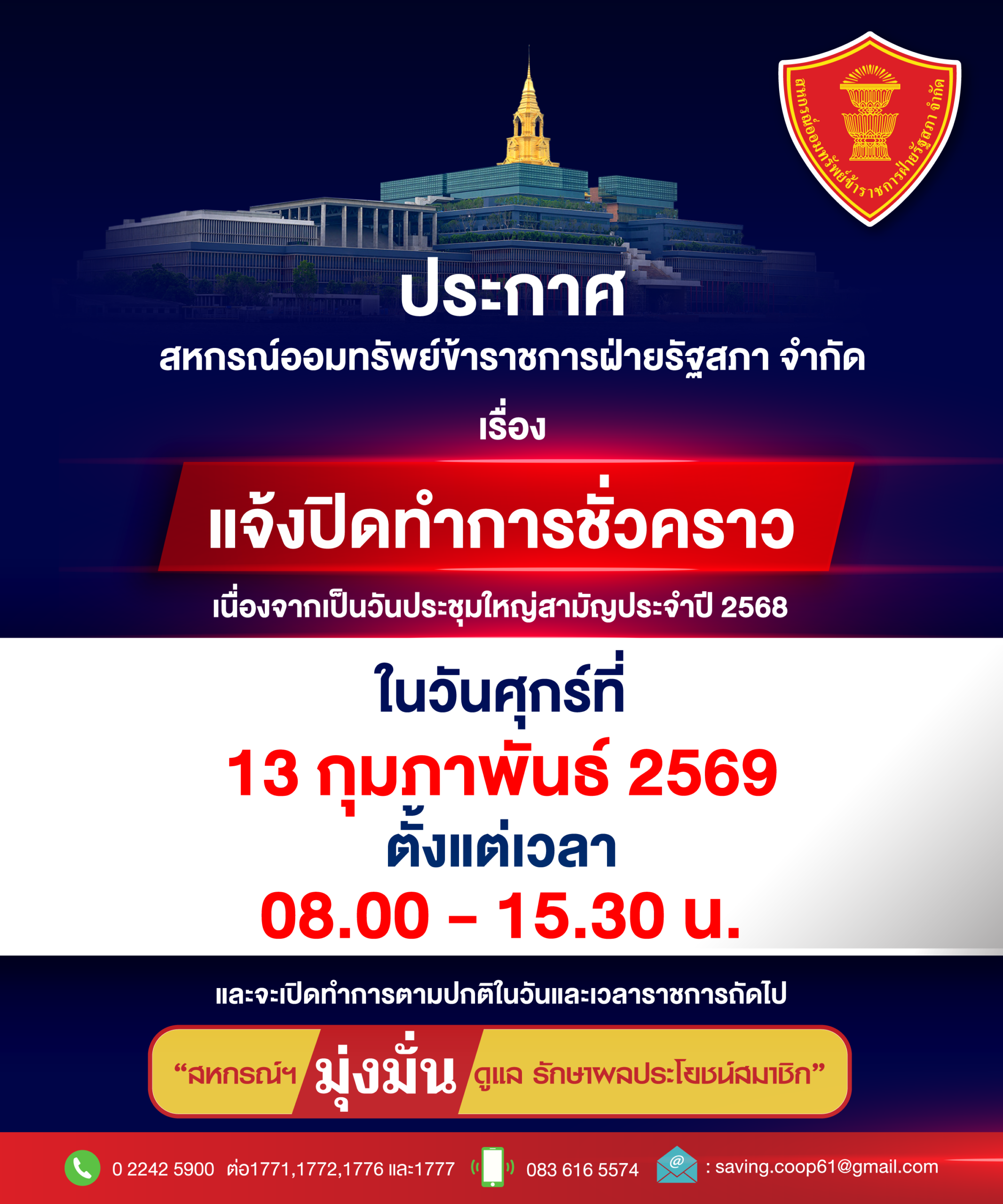 ประกาศ สหกรณ์ออมทรัพย์ฯ เรื่อง แจ้งปิดทำการชั่วคราว ในวันศุกร์ที่ 13 กุมภาพันธ์ 2569 เนื่องจากเป็นวันประชุมใหญ่สามัญประจำปี 2568