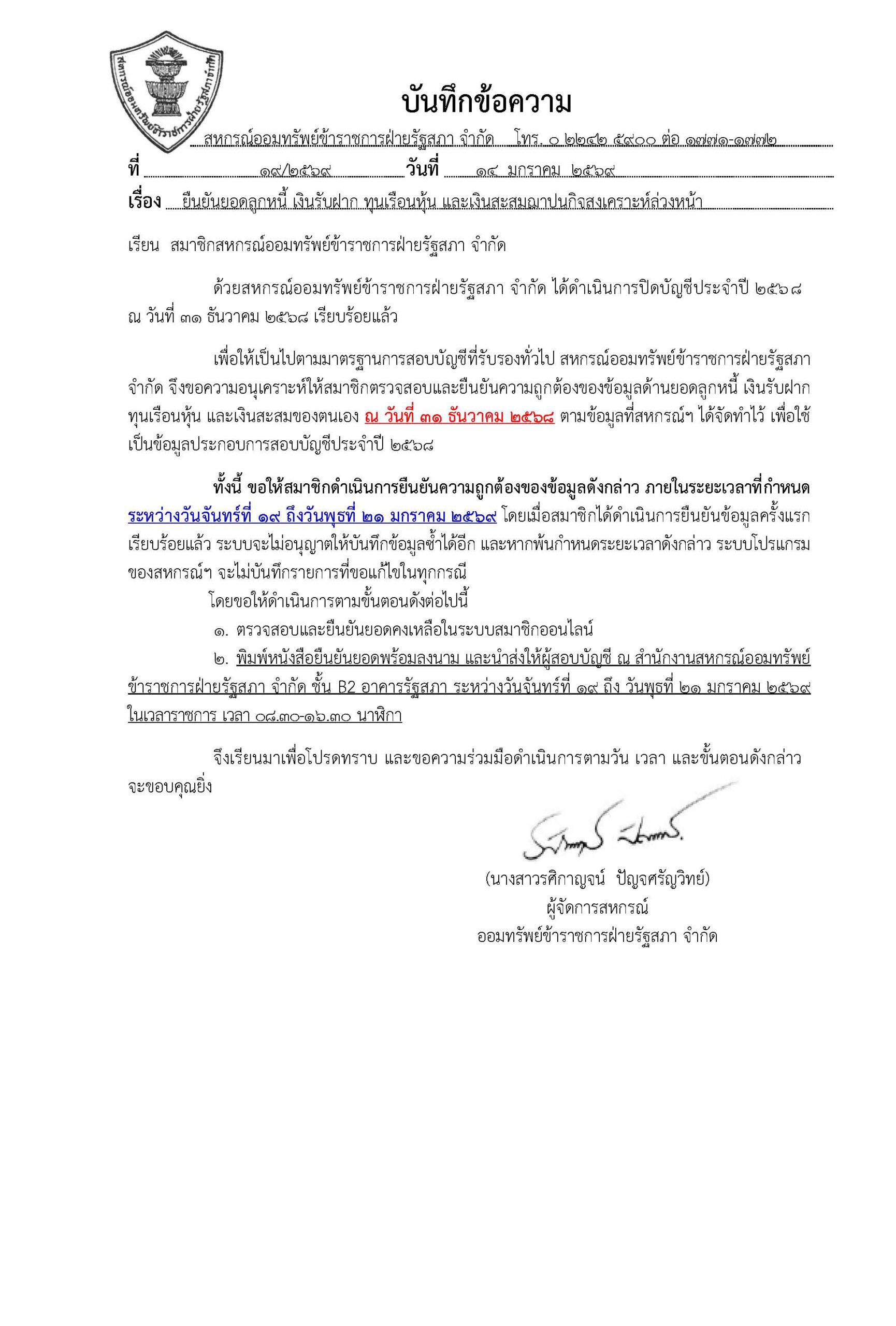 และพิมพ์หนังสือยืนยันยอดพร้อมลงนาม และนำส่งให้ผู้สอบบัญชี ณ สำนักงานสหกรณ์ออมทรัพย์ข้าราชการฝ่ายรัฐสภา จำกัด ชั้น B2 อาคารรัฐสภา ระหว่างวันจันทร์ที่ 19 ถึง วันพุธที่ 21 มกราคม 2569 ในเวลาราชการ เวลา 08.30-16.30 นาฬิกา