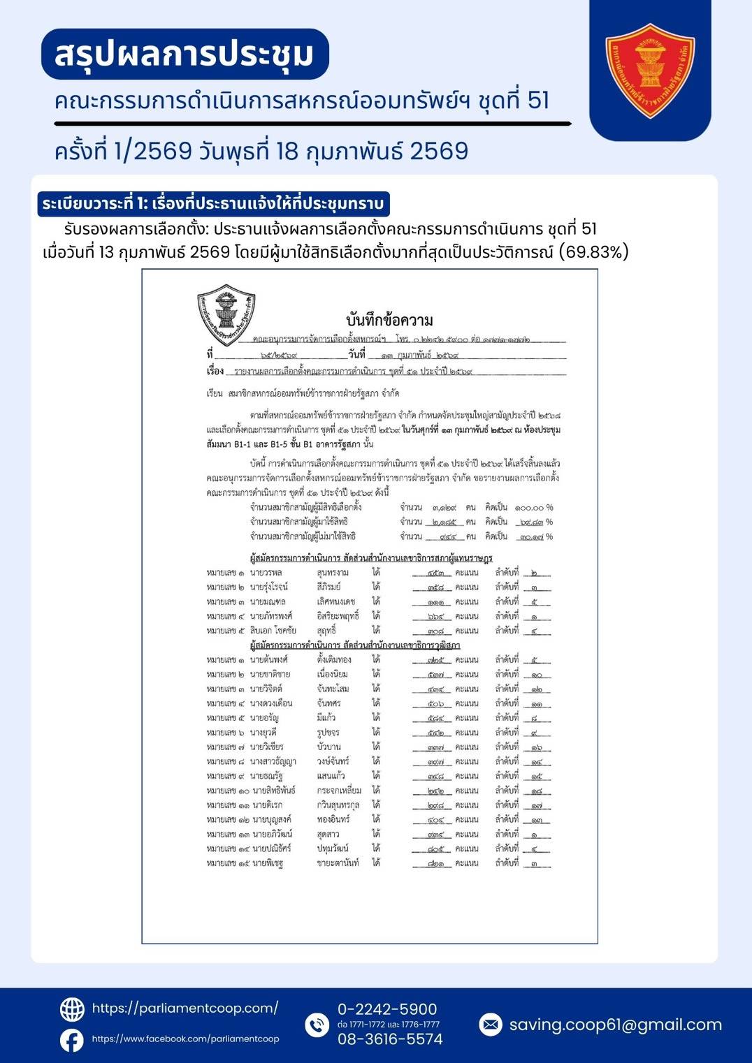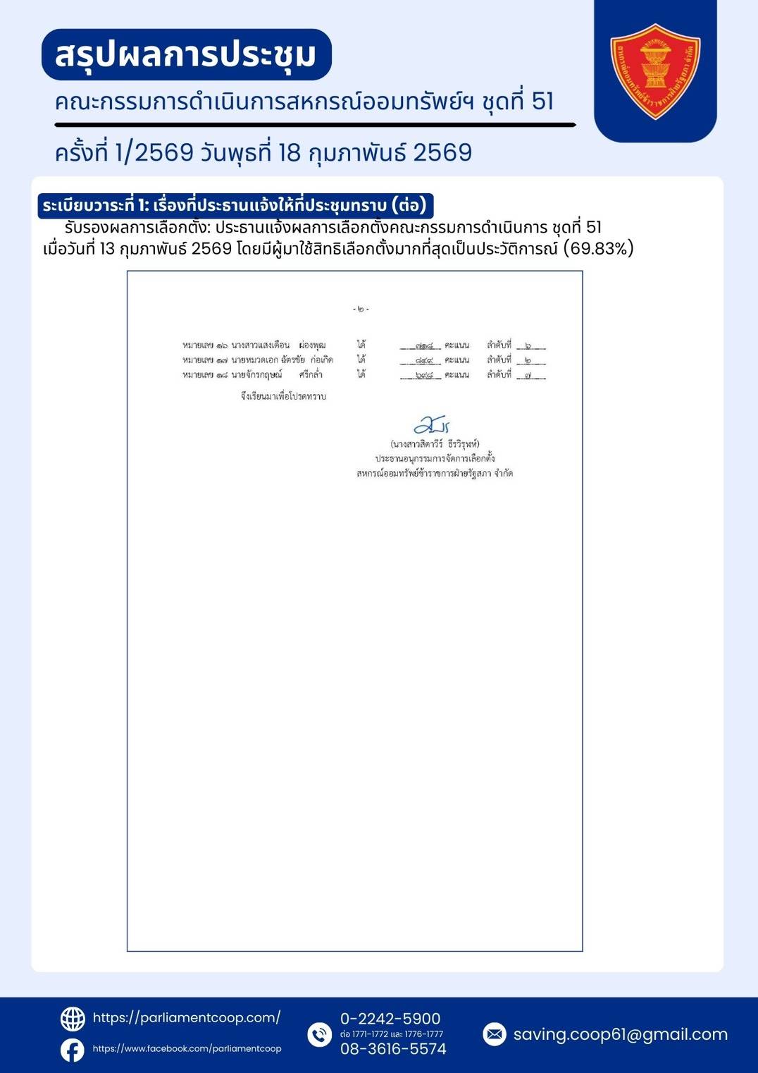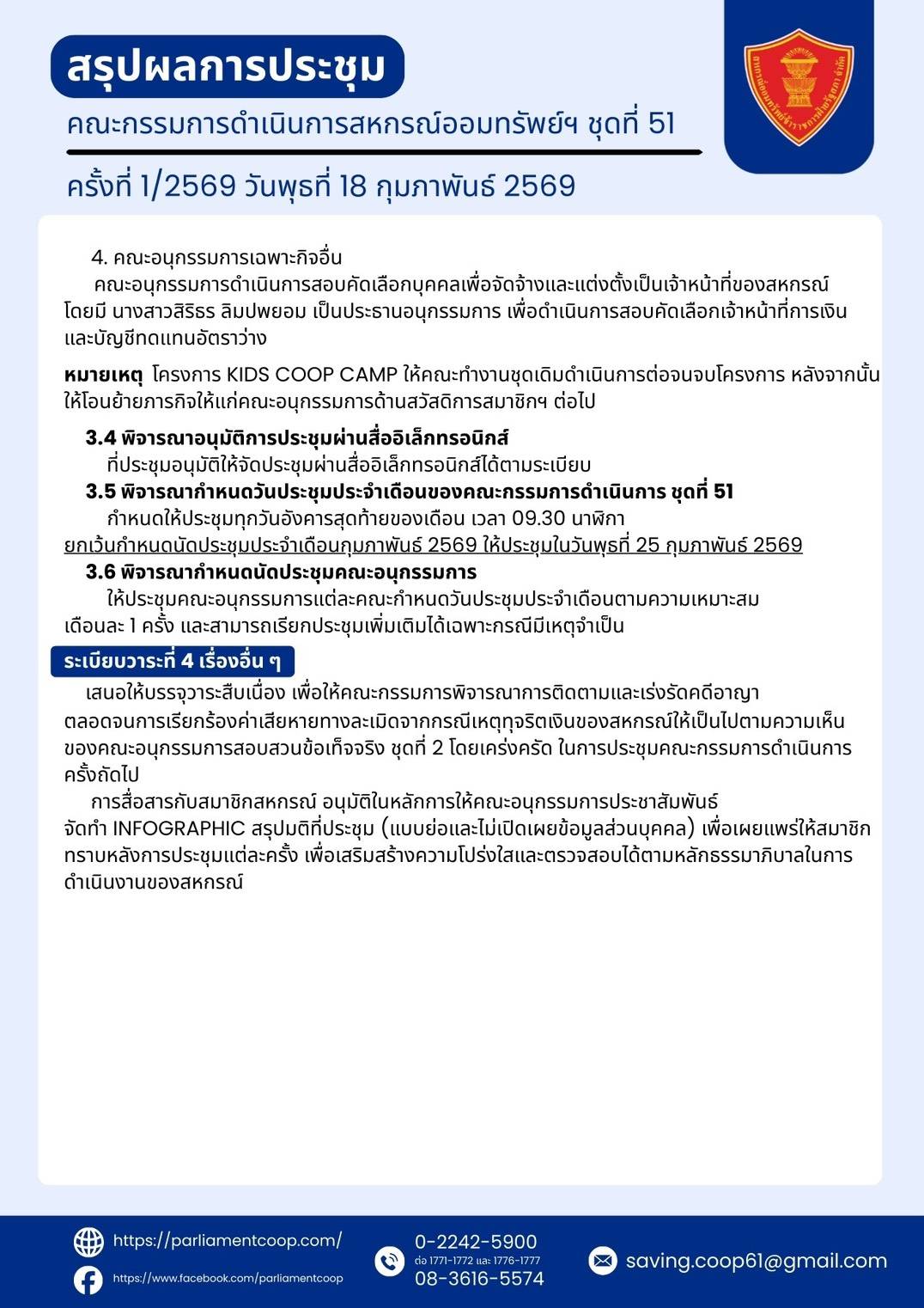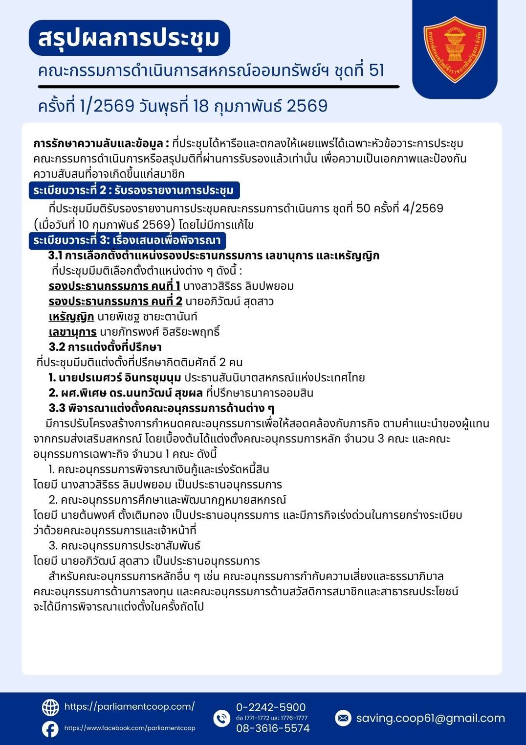 สรุปผลการประชุมคณะกรรมการดำเนินการสหกรณ์ออมทรัพย์ฯ ชุดที่ 51 ครั้งที่ 1/2569 วันพุธที่ 18 กุมภาพันธ์ 2569