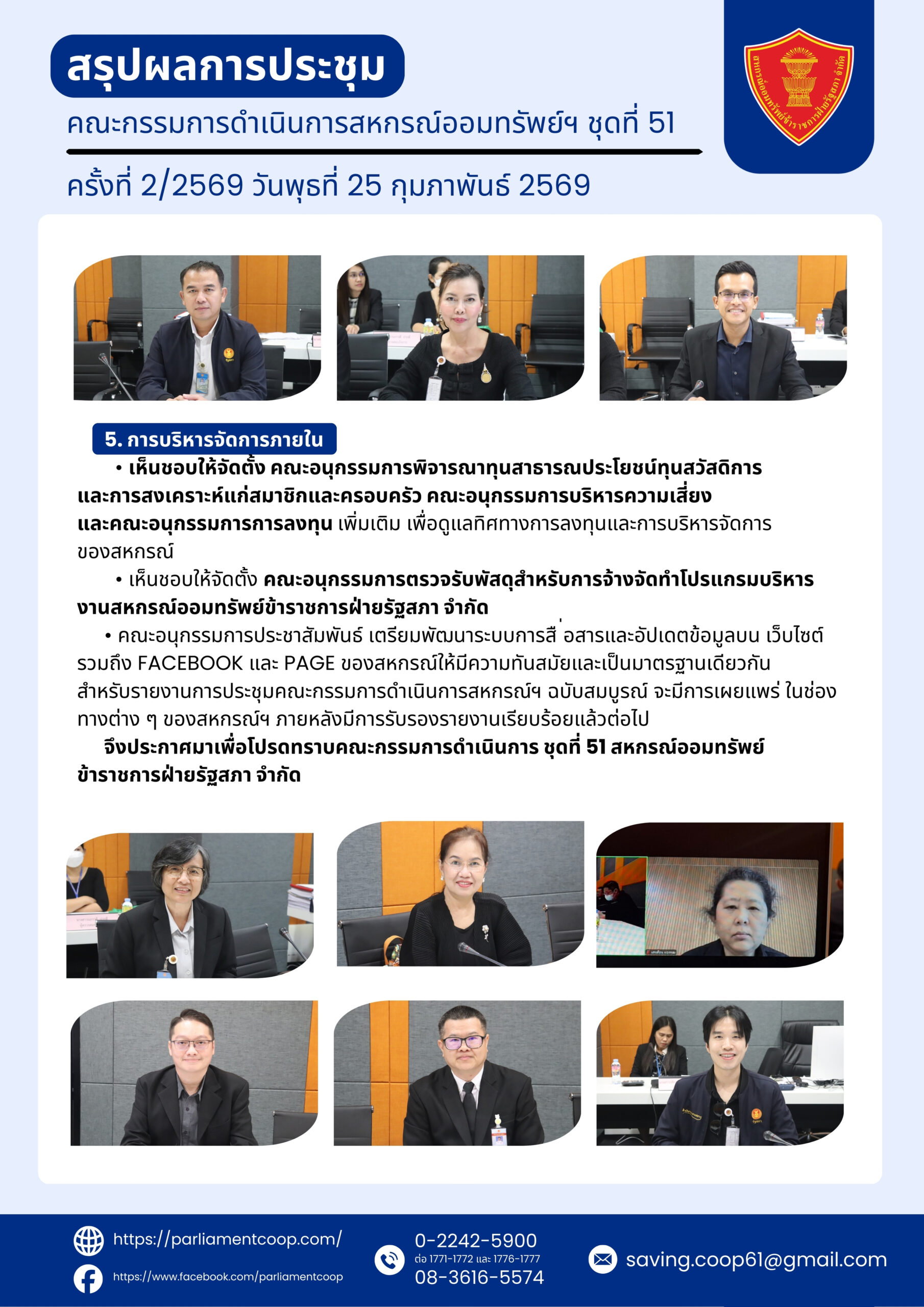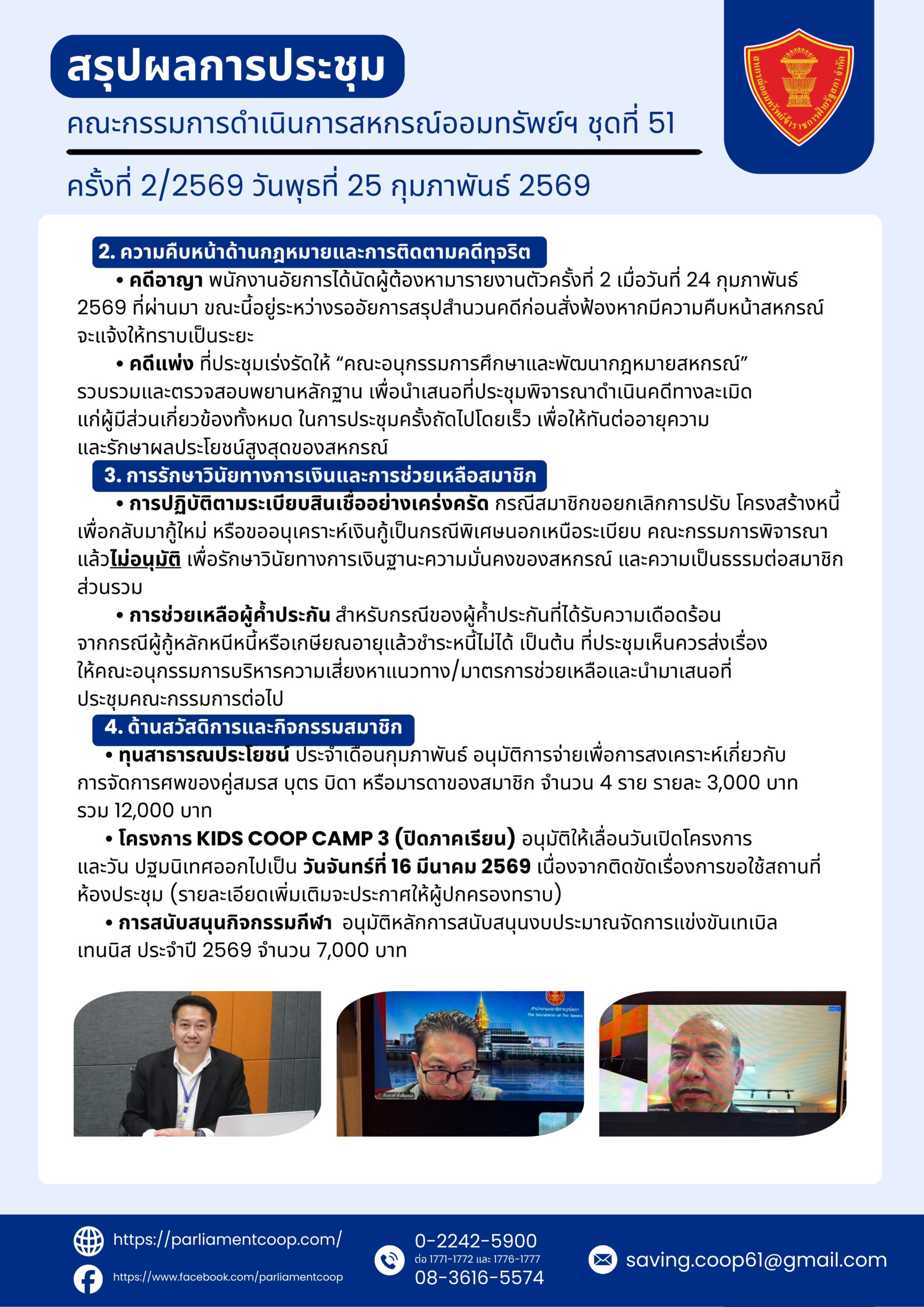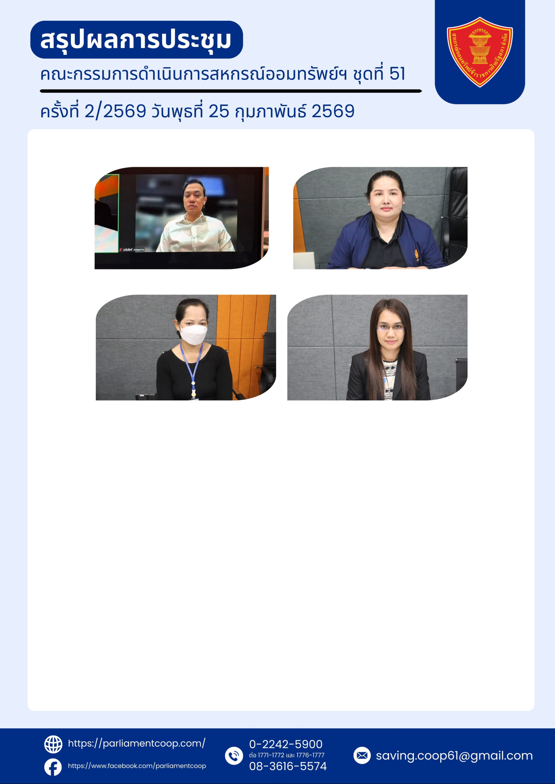 สรุปผลการประชุมสรุปผลการประชุมคณะกรรมการดำเนินการสหกรณ์ออมทรัพย์ฯ ชุดที่ 51 ครั้งที่ 2/2569 วันพุธที่ 25 กุมภาพันธ์ 2569 สรุปผลการประชุม
