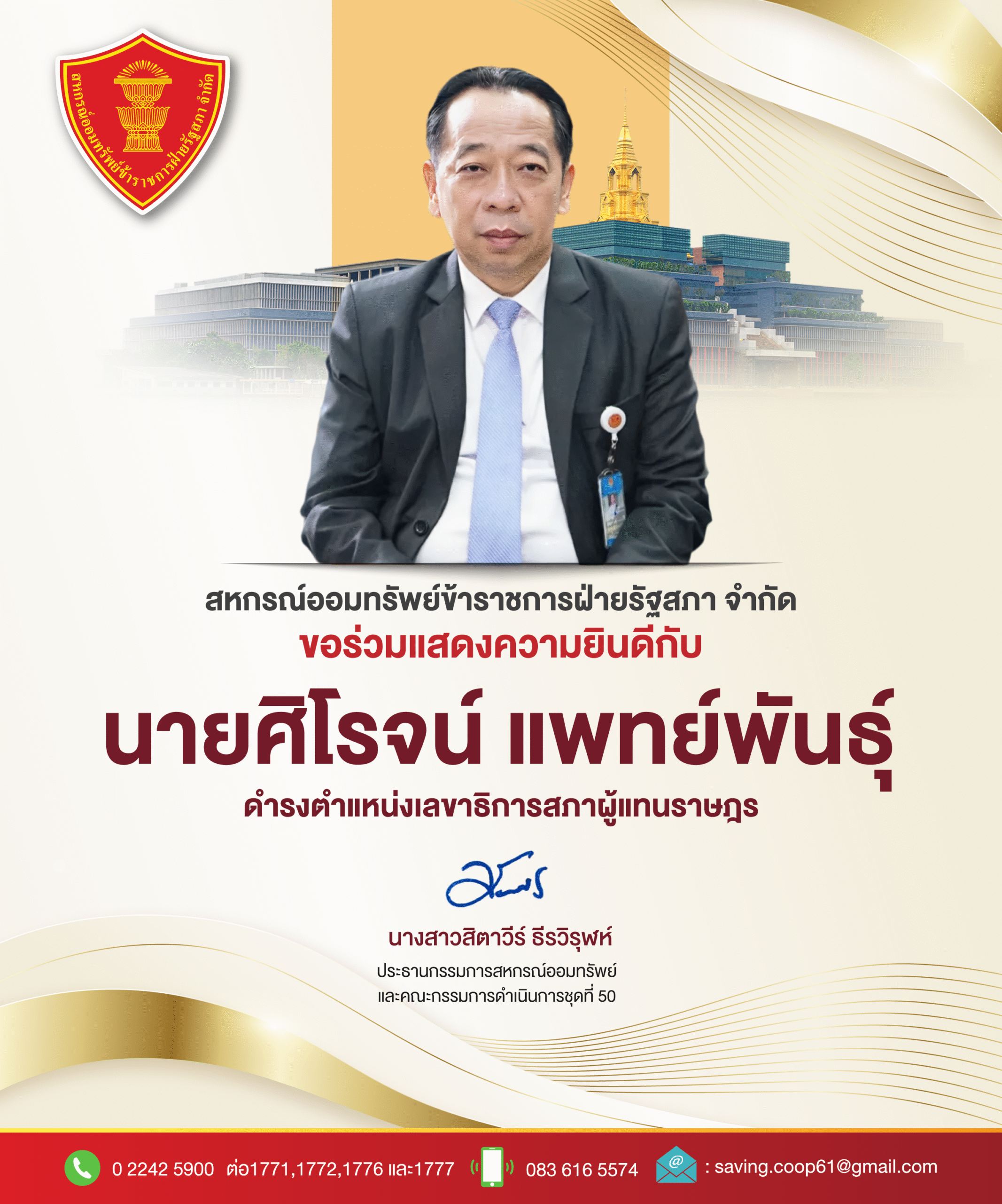 สหกรณ์ออมทรัพย์ข้าราชการฝ่ายรัฐสภา จำกัด ขอร่วมแสดงความยินดีกับ นายศิโรจน์ แพทย์พันธุ์ ดำรงตำแหน่งเลขาธิการสภาผู้แทนราษฎร